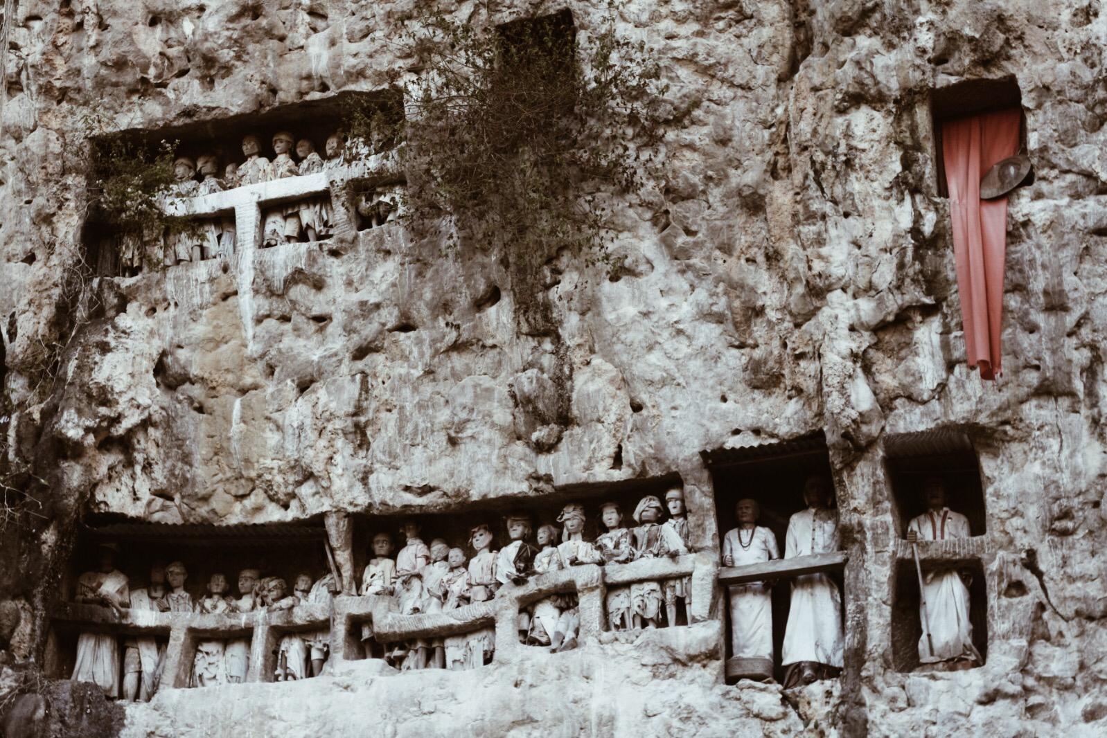 Pienamente soddisfatta dalla marea di informazioni, che Anda è riuscito a darci nel corso della nostra passeggiata, siamo arrivati al cuore della nostra giornata, nonché al motivo principale per il quale siamo venuti fin qui: le cerimonie funebri del popolo dei Toraya. Camminando tra i sentieri ci siamo più volte imbattuti nei tradizionali luoghi di sepoltura, scavati nella roccia e abbelliti dai tipici pupazzi di stoffa, che a modo loro, raccontano di vicende passate. Persino un albero abbiamo scoperto accogliere le salme dei bambini morti prima mettere i denti da latte. Questi, secondo la cultura animista, in quanto esseri puri, è giusto che tornino alla natura, riposando nella corteccia di un albero antico.